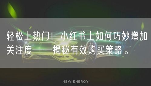 购买策略是增加关注度的重要手段。在小红书上,可以通过广告投放、合作推广等方式进行购买。但是,要想取得良好的效果,需要巧妙运用购买策略。可以根据自身需求和预算,选择合适的购买方式,提高关注度和曝光率。